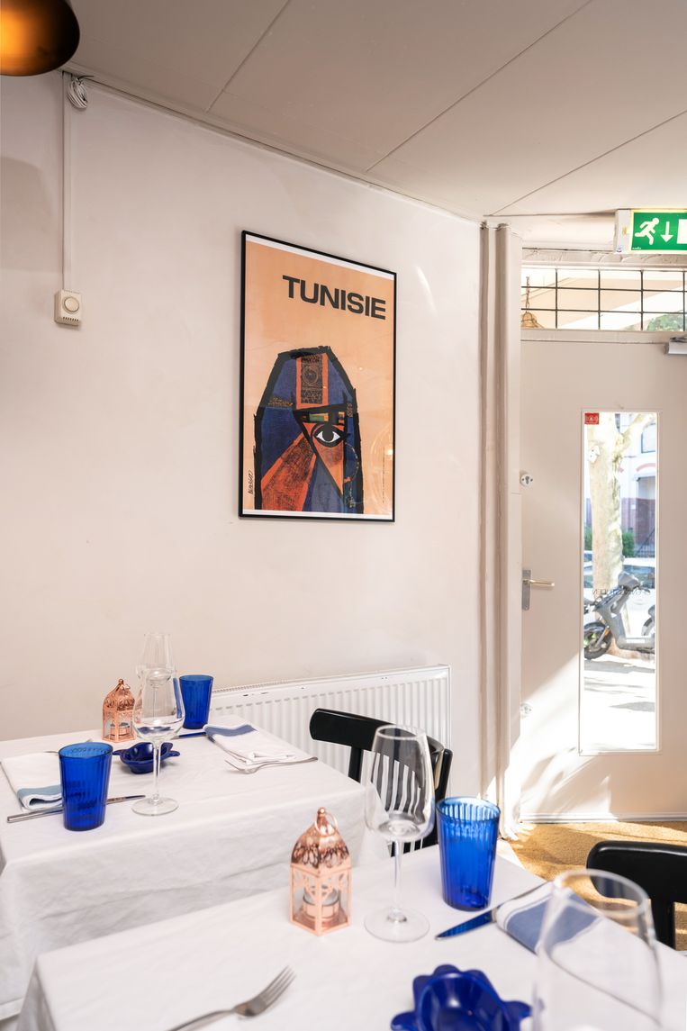 Restoran yang menyajikan makanan Tunisia dan Mediterania. Lebih banyak makan siang dan barang bawaan.