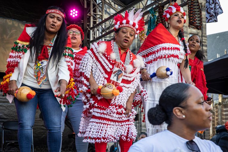 Saskia Seinbalin (58), yang bernama Gorishjiri, akan bernyanyi bersama kelompok penyanyi Vyamu Woreyen. Ia mengenakan pakaian adat, penutup kepala dan selendang berwarna merah putih. “Ini tentang penindasan terhadap penduduk asli Suriname,” katanya. Dan mereka masih distigmatisasi. Lihat kekacauannya sekarang.” Dia mengacu pada kerusuhan baru-baru ini di negara itu: Pada hari Selasa, dua orang tewas dan beberapa lainnya terluka dalam bentrokan antara polisi dan warga sipil di desa asli Suriname, Pikin Saron.