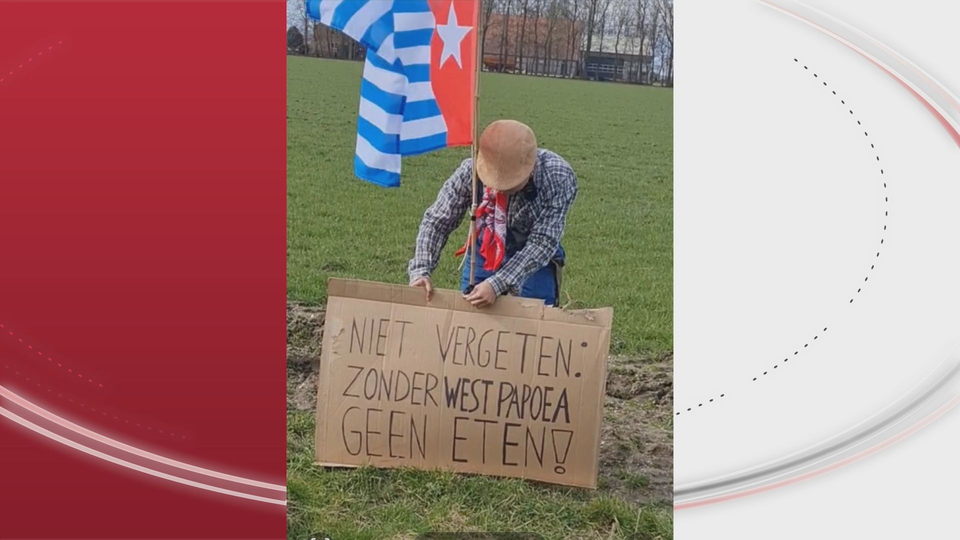 Selain beberapa bendera Belanda terbalik, ada juga beberapa bendera di padang rumput A6 dekat Nagele sejak Minggu. Di atas Monnikenweg para aktivis berpakaian petani memasang beberapa bendera Papua Barat.